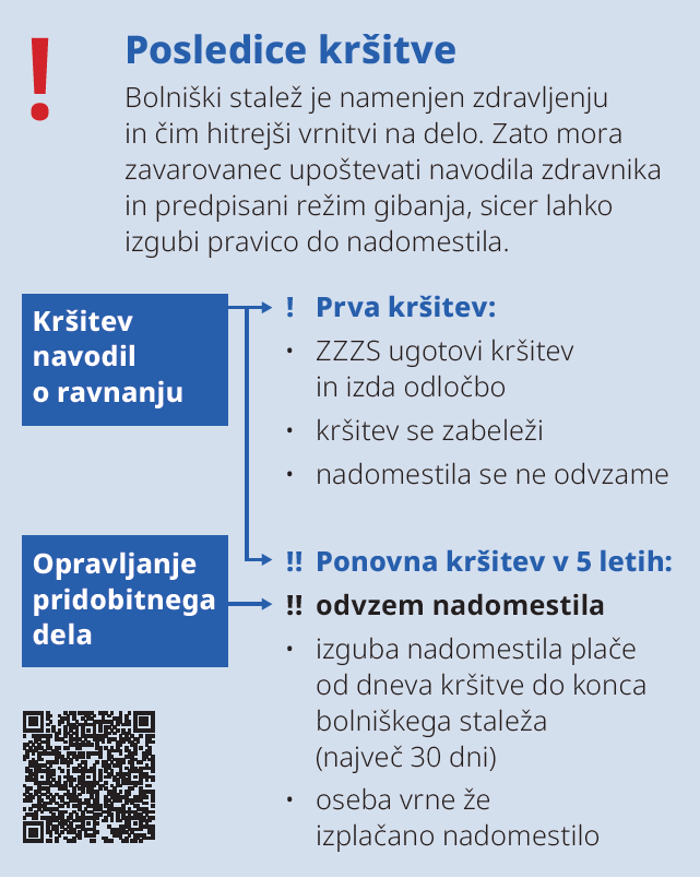 V primeru, če zavarovanec ne upošteva pisnih navodil o ravnanju med zadržanostjo od dela, se mu nadomestilo ob prvi kršitvi ne odvzame. Za prvo kršitev se šteje kršitev, ki jo je zavarovanec storil enkrat v obdobju petih let. Navedeno pomeni, da če zavarovanec v petih letih stori le eno kršitev, se mu nadomestilo ne odvzame, če pa v obdobju petih letih ponovno stori kršitev, pa se mu nadomestilo za naslednje kršitve odvzame. V primeru naslednjih kršitev zavarovancu nadomestilo med začasno zadržanostjo od dela ne pripada od dneva ugotovljene kršitve do izteka začasne zadržanosti od dela, vendar ne dlje kot 30 dni.